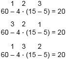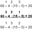 | 3 • (21 - 12) = 27 | 50 : 5 • 6 = 60 |