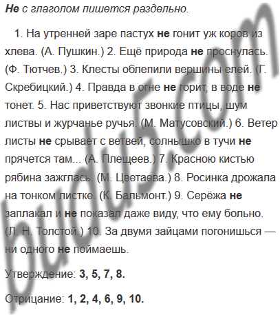 1. На утренней заре пастух (не)гонит уж коров из хлева. (А. Пушкин.) 2. Ещё природа (не)проснулась. (Ф. Тютчев.) 3. Клесты облепили вершины елей. (Г. Скребицкий.) 4. Правда в огне (не)горит, в воде (не)тонет. 5. Нас приветствуют звонкие птицы, шум листвы и журчанье ручья. (М. Матусовский.) 6. Ве1ер листы (не)срывает с ветвей, солнышко в тучи (не) прячется там... (А. Плещеев.) 7. Красною кистью рябина зажглась. (М. Цветаева.) 8. Росинка дрожала на тонком листке. (К. Бальмонт.) 9. Серёжа (не)заплакал и (не)показал даже виду, что ему больно. (Л. Н. Толстой.) 10. За двумя зайцами погонишься — ни одного (не)поймаешь.