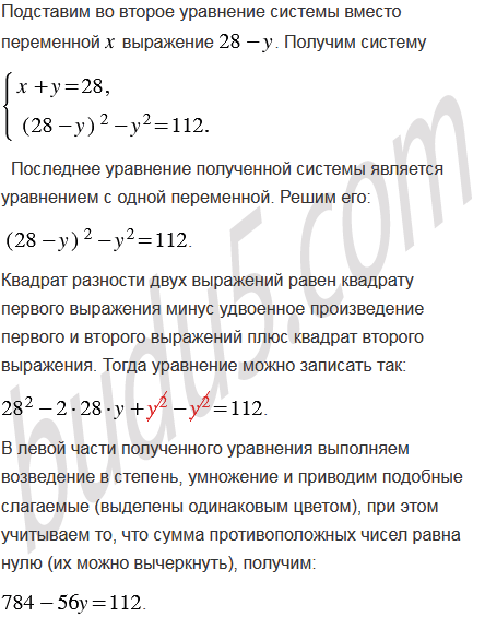 Сумма двух чисел равна 28, а разность их квадратов составляет 112. Найдите эти числа.