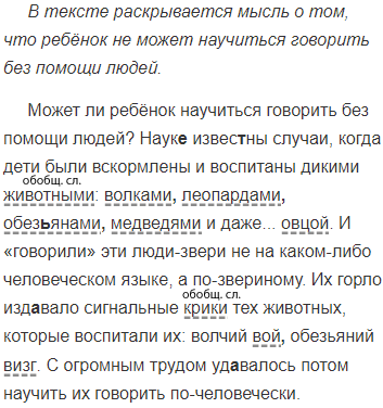 Может ли ребёнок научиться говорить без помощи людей? Наук.. извес(?)ны случаи, когда дети были вскормлены и воспитаны дикими животными: волками леопардами обез(?)янами медведями и даже... овцой. И «говорили» эти люди-звери не на каком-либо человеческом языке, а по-звериному. Их горло изд..вало сигнальные крики тех животных, которые воспитали их: волчий вой обезьяний визг. С огромным трудом уд..валось потом научить их говорить по-человечески.