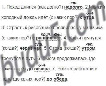 1. Поход длился (как долго?) недолго. 2. Мелкий холодный дождь идёт (с каких пор?) с утра. 3. Страсть к рисованию проявилась у мальчика (с каких пор?) с ранних лет. 4. Уроки начнутся (когда?) через час. 5. Отряд (когда?) утром тронулся в путь. 6. Вьюга продолжалась (до каких пор?) до вечера. 7. Ребята работали в поле (до каких пор?) до обеда.